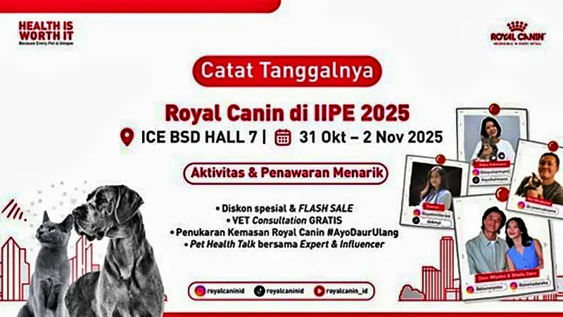 Pengunjung yang hadir ke IIPE 2025 akan diajak menjelajahi booth Royal Canin, belajar langsung dari para ahli, dan menemukan bagaimana nutrisi yang tepat dapat mengubah kehidupan hewan kesayangan karena Health Is Worth It, and Every Pet is Unique.