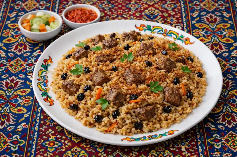 Dalam penyajiannya, nasi kebuli sering dilengkapi dengan kismis, bawang goreng, acar, dan sambal. Kombinasi ini menciptakan perpaduan rasa gurih, sedikit manis, dan segar.